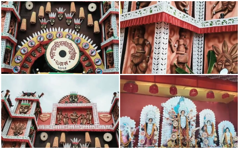 পলাশচাবড়ী সর্বজনীনের থিম ‘ধামসা মাদলের দেশে মা আপন বেশে’