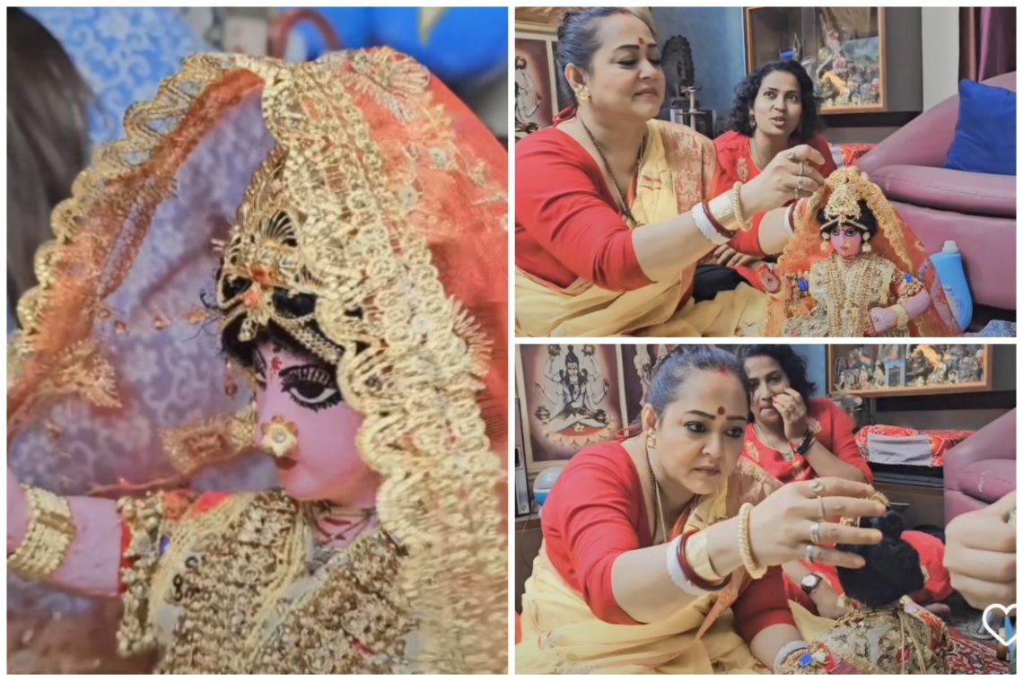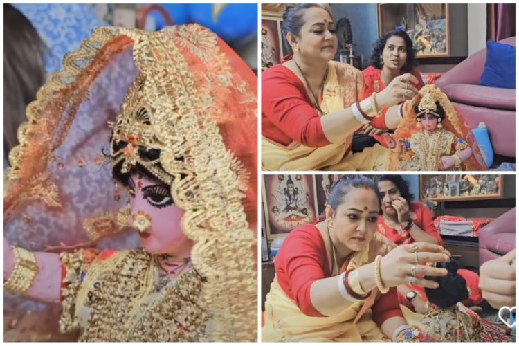 এবার বেহালার হাজরা পরিবারের মা লক্ষ্মীর পরনে রয়েছে বিশেষ সাজ। জানা গিয়েছে, গোপাল তাঁর বউয়ের জন্য শাড়ি আর গয়না পাঠিয়েছে, আর সেই শাড়ি-অলঙ্কারেই সেজেছেন মা লক্ষ্মী। আসলে বর্তমানে ‘জল থই থই ভালোবাসা’য় অভিনয়ের পাশাপাশি জি বাংলার ঘরে ঘরে জি বাংলা-র সঞ্চালক রূপেও কাজ করছেন অপরাজিতা। সেই সূত্রেই রাজ্যের নানান প্রান্তে ঘুরে বেড়ান অভিনেত্রী। এই শো-এর হাত ধরেই তাঁর সঙ্গে আলাপ হয়েছিল মায়াপুরের দেবযানীর সঙ্গে। তাই তিনিই এবার মা লক্ষ্মীর পোশাক এবং গয়না পাঠিয়েছেন। যেটি অভিনেত্রী নিজেই মা লক্ষীকে সাজানোর ভিডিও দিয়ে ক্যাপশনে লিখেছেন। অপরাজিতা লেখেন, ‘আমার এবছরের মা লক্ষ্মীর সাজ এবারে মা লক্ষ্মীর যে পোশাক এবং যে গয়না সেটা মায়াপুর থেকে আমার এক বোন পাঠিয়েছেন (দেবযানি) তার বাড়ি আমরা ঘরে ঘরে জি বাংলার জন্যে গিয়েছিলাম তার গোপাল আছে এবং তার গোপাল আমার মা লক্ষ্মীকে অর্থাৎ তার বউকে তার পোশাক এবং গয়না পাঠিয়েছেন তাই মা এবারে চটপট করে খুব সুন্দর ভাবে সেজে নিয়েছে’।