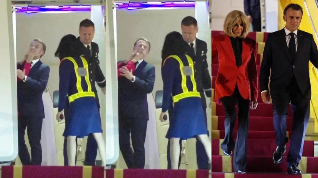 ব্রিটিশ সংবাদমাধ্যম ‘সান’ জানিয়েছে, দক্ষিণ-পূর্ব এশিয়া সফরে গতকাল রবিবার (২৫ মে) সন্ধ্যায় ভিয়েতনামের রাজধানী হ্যানয়ে পা রেখেছেন ফরাসি প্রেসিডেন্ট ইমান্যুয়েল ম্যাক্রোঁ। আর ফরাসি প্রেসিডেন্টের বিমান হ্যানয়  বিমানবন্দরের মাটি ছোঁয়ার পরেই ঘটে বেনজির ঘটনা। ধারণ করা ফুটেজে দেখা যাচ্ছে, বিমানের দরজা খোলা অবস্থায় ভিতরে দাঁড়িয়ে আছেন ফরাসি প্রেসিডেন্ট। কটমট চোখে তাকাচ্ছেন স্ত্রী ব্রিজিতের দিকে। কয়েক সেকেন্ডের মধ্যেই ফরাসি প্রেসিডেন্টের স্ত্রী সবাইকে হতবাক করে ম্যাক্রোঁর মুখ লক্ষ্য করে ঘুষি চালান। স্ত্রীর ওই প্রতিক্রিয়ায় বিস্মিত হয়ে যান ম্যাক্রোঁ। তবে অস্বস্তি ও বিড়ম্বনা কাটাতে দ্রুত বিমানের সিঁড়ির দিকে হাত নাড়তে শুরু করেন। এরপর ফরাসি প্রেসিডেন্ট ও ফার্স্ট লেডি বিমান থেকে একসঙ্গে বেরিয়ে সিঁড়ি বেয়ে নিচে নেমে আসেন। ম্যাক্রোঁ তার স্ত্রীর দিকে হাত বাড়িয়ে দেন। কিন্তু স্ত্রী তার পরিবর্তে সিঁড়ির রেলিং ধরে রাখেন।