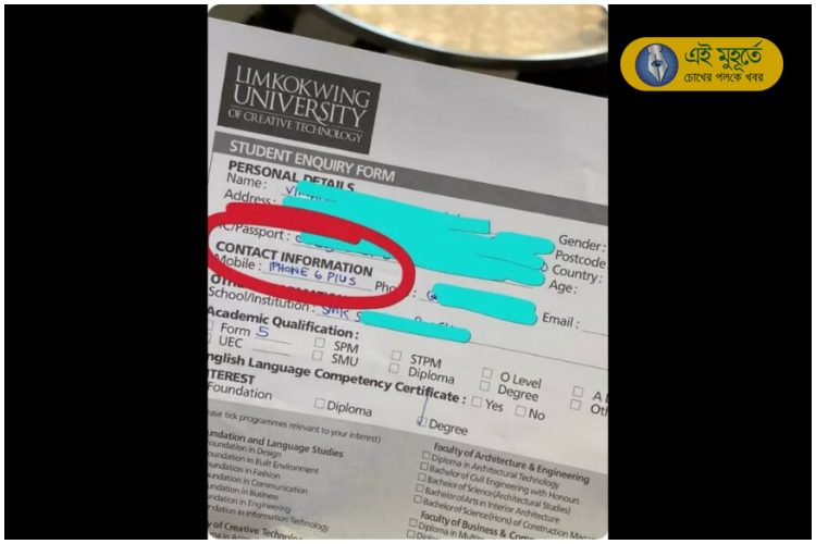 ঘটনাটি ঘটেছে মালয়েশিয়ায়। এখানকার লিমককউইং (LimKokWing) বিশ্ববিদ্যালয়ে ভর্তির জন্য আবেদন করে এক পড়ুয়া। বিশ্ববিদ্যালয়ে সম্প্রতি একটি নতুন পাঠক্রম চালু হয়েছে। সেই পাঠক্রমে ভর্তির জন্য আবেদন করেন ওই পড়ুয়া (student) । নামের জায়গায় নিজের নাম লেখেন। বাবার নামের জায়গায় বাবার নাম। বিবাহিত না অবিবাহিত সেটাও লেখেন। শিক্ষাগত যোগ্যতার (educatioal qualification) জায়গায় সঠিক তথ্য দাখিল করেন। ঠিকানার জায়গায় যা লেখার কথা, ঠিক সেটাই লেখেন। আর ফোন নম্বরে জায়গায় সে নিজের নম্বরে বদলে লিখে দিল তাঁর মোবাইল ফোনের মডেল নম্বর। পড়ুয়া যে মোবাইলটি (mobile) ব্যবহার করে সেটি হল iPhone 6 Plus।
