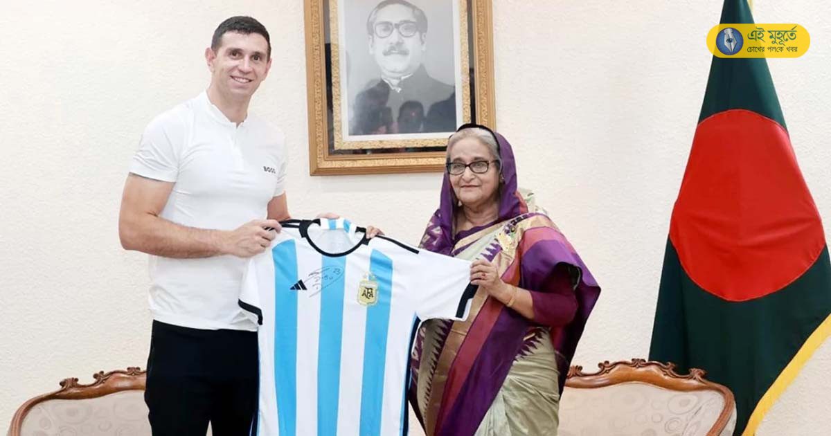সোমবারই কয়েক ঘন্টার ঝটিকা সফরে ঢাকায় পা রেখেছিলেন আর্জেন্টিনাকে বিশ্বকাপ পাইয়ে দেওয়ার অন্যতম নায়ক এমিলিয়ানো মার্তিনেজ। সকালে স্পনসরদের এক অনুষ্ঠানে যোগ দেন। দুপুরে গণভবনে গিয়ে বাংলাদেশের প্রধানমন্ত্রী শেখ হাসিনার সঙ্গে দেখা করেন। কাতার বিশ্বকাপে আর্জেন্টিনার সমর্থনে যেভাবে গলা ফাটিয়েছিলেন বাংলাদেশের ফুটবল সমর্থকরা তার জন্য কৃতজ্ঞতাও প্রকাশ করেন। সৌজন্য সাক্ষাতের সময়েই উপহার হিসেবে বাংলাদেশের প্রধানমন্ত্রীর হাতে আর্জেন্টিনার জাতীয় দলের জার্সি তুলে দেন মার্তিনেজ। সূত্রের খবর, আর্জেন্টিনার গোলরক্ষককে বঙ্গবন্ধু কন্যা জানান, তিনি ব্রাজিলের ভক্ত হলেও আর্জেন্টিনার খেলাো দেখেন। এমনকি লিওনেল মেসির খেলাও পছন্দ করেন।