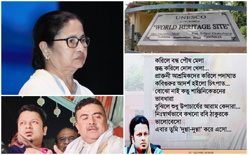 নিজস্ব প্রতিনিধি: বিরল থেকে বিরলতম ঘটনা বললেও খুব কম বলা হয়। রাজ্য রাজনীতিতে এদৃশ্য এর আগে কখনও দেখাই যায়নি। মমতা বন্দ্যোপাধ্যায়ের(Mamata Banerjee) পাশে রাজ্যের বিরোধী দলনেতা থেকে বঙ্গ বিজেপির(Bengal BJP) একাধিক নেতা। সবার সুরও এখন এক। কার্যত মমতা যে সুরে আক্রমণ শানিয়েছেন, অনুরোধ করেছেন, সেই একই সুরে, তাঁর দেখানো পথেই হাঁটা দিয়েছেন বিজেপির নেতারা। নজরে বিশ্বভারতী বিশ্ববিদ্যালয়ের(Viswabharati University) উপাচার্য(Vice Chancellor) বিদ্যুৎ চক্রবর্তী(Bidyut Chakrabarty)। সম্প্রতি UNESCO শান্তিনিকেতনকে(Shantiniketan) World Heritage Site’র তকমা দিয়েছে। কিন্তু বিশ্বভারতী কর্তৃপক্ষ যে ফলকটি বিশ্ববিদ্যালয় প্রাঙ্গণে বসিয়েছে, সেটিকে কেন্দ্র করে এখন তীব্র সমালোচনার ঝড় উঠেছে। কেননা ফলকে শান্তিনিকেতনের প্রাণপুরুষ রবীন্দ্রনাথ ঠাকুরের(Rabindranath Tagore) নামই নেই। আছে বিশ্বভারতীর আচার্য হিসাবে প্রধানমন্ত্রী নরেন্দ্র মোদি এবং উপাচার্য হিসাবে বিদ্যুৎ চক্রবর্তীর নাম। মমতাই সবার আগে সেই নিয়ে বিরোধিতা শুরু করেন। এখন একে একে সেই সুরে সুর মিলিয়ে চলেছেন বঙ্গ বিজেপির নেতারা। গতকাল অর্থাৎ রবিবার মুখ খুলেছিলেন শুভেন্দু অধিকারী(Suvendu Adhikari), সোমবার মুখ খুললেন অনুপম হাজরা(Anupam Hazra)।