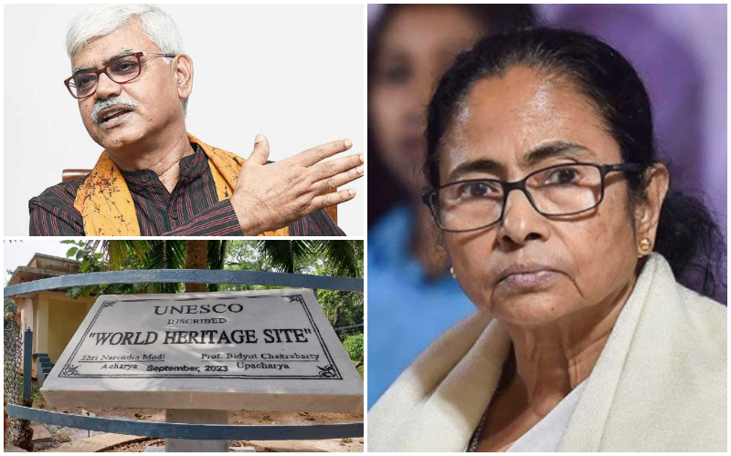 নিজস্ব প্রতিনিধি: পুজোর কিছু দিন আগেই UNESCO’র তরফ থেকে শান্তিনিকেতনকে World Heritage Site’র তকমা দেওয়া হয়। সেই স্বীকৃতির পর, বিশ্বভারতী বিশ্ববিদ্যালয়ের উপাচার্য বিদ্যুৎ চক্রবর্তীর নির্দেশে শান্তিনিকেতনের(Shantiniketan) ক্যাম্পাসে ৩টি ফলক বসায় কর্তৃপক্ষ। কিন্তু সেখানে প্রধানমন্ত্রী ও উপাচার্যের নাম থাকলেও রবীন্দ্রনাথ ঠাকুরের(Rabindranath Tagore) নাম ব্রাত্য রাখা হয়। এই ঘটনায় উপাচার্য বিদ্যুৎ চক্রবর্তীর বিরুদ্ধে সমালোচনার ঝড় উঠে। গত সপ্তাহের বৃহস্পতিবার সাংবাদিক সম্মেলনে মুখ্যমন্ত্রী মমতা বন্দ্যোপাধ্যায়(Mamata Banerjee) সেই বিষয় নিয়ে সরব হয়েছিলেন। পরেরদিন থেকে তাঁর নির্দেশেই শান্তিনিকেতনের কবিগুরু হস্তশিল্প কেন্দ্রের সামনে আন্দোলন শুরু করে তৃণমূল। সেই আন্দোলন এখনও চলছে। এরই মাঝে মুখ্যমন্ত্রী সোমবার ফের একবার তিনি সরব হলেন বিশ্বভারতীর বিতর্কিত স্মারকফলক এখনই সরানোর দাবি জানিয়ে।