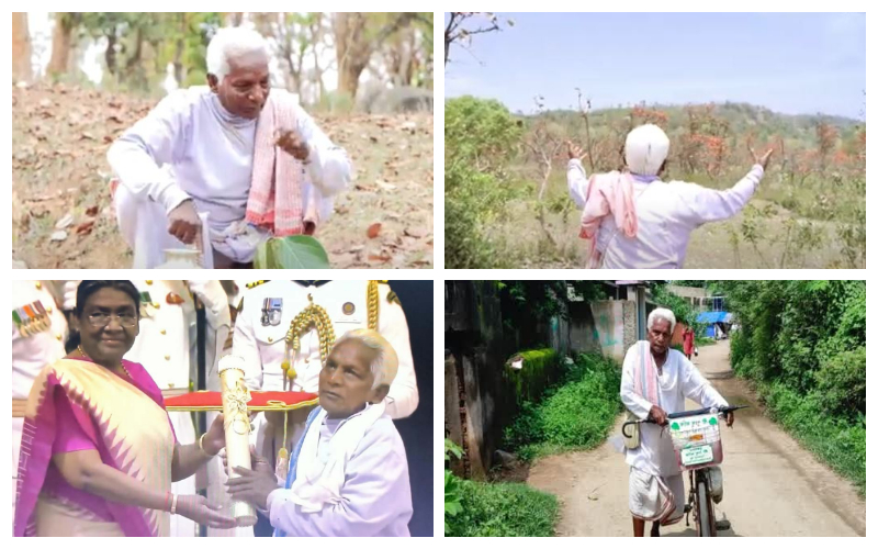 নিজস্ব প্রতিনিধি, বাঘমুণ্ডি : মাটির রঙচটা দেওয়াল। ছাদের ত্রিপলের ছাউনি। ঘরের বহু জায়গায় ফাল। সেই দেওয়ালেই ঝুলছে পদ্মশ্রী পুরস্কার। স্কুল পাস না করলেও গাছ তাঁর নেশা। গাছের প্রতি প্রেম ও ভালোবাসা তাকে নিয়ে গিয়েছে রাইসিনা হিলসে। গাছের নেশাই তাঁকে বাঘমুণ্ডির গ্রাম থেকে পৌঁছে দিয়েছে রাষ্ট্রপতি দ্রৌপদী মুর্মুর সামনে। তিনি আর কেউ নয়, ইনি হলেন বাঘমুন্ডির প্রত্যন্ত গ্রাম সিন্দরির বাসিন্দা বছর আশির দুখু মাঝি। গাছ নিয়ে তাঁর জগৎ। প্রায় ৫ হাজারের বেশি গাছ লাগিয়েছেন তিনি।
