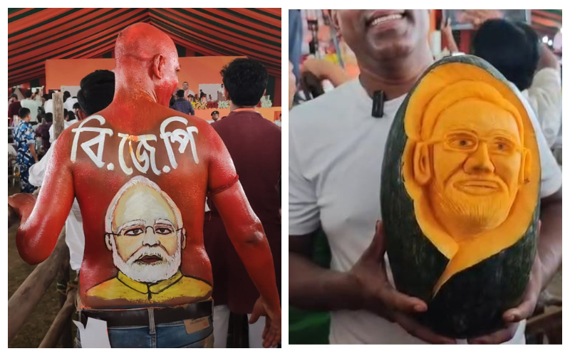 কেউ কুমড়োয় আঁকলেন মোদিকে, কারও শরীরজুড়ে ‘জয় শ্রী রাম’, প্রধানমন্ত্রীর সভায় বিচিত্র ছবি